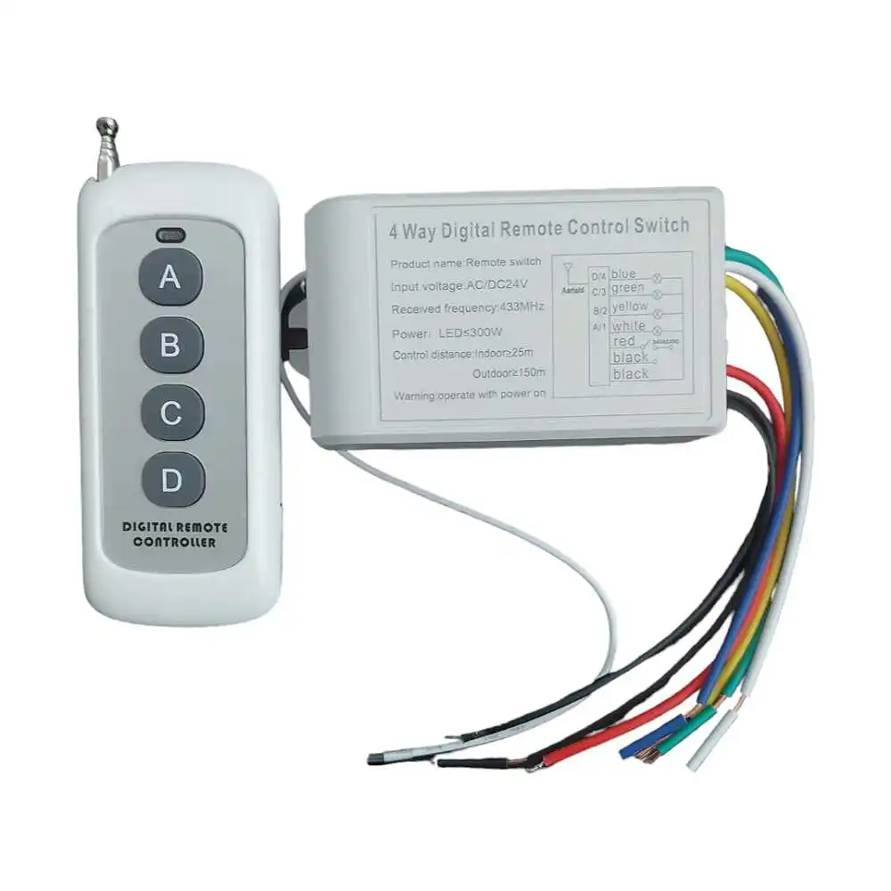 Δέκτης 24v 4 εντολές υψηλής ποιότητας. Ο έλεγχος είναι ασύρματος και η συχνότητά του είναι 433ΜHz. Ο δέκτης είναι ιδανικός για έλεγχο φώτων, TV, μηχανές, ανεμιστήρες, φωτογραφικές μηχανές, τηλεοπτικά σήματα, ακουστικά σήματα, ηλεκτρικά αυτοκινήτων , παραθύρων, κλειδαριών πορτών. πόρτας γκαράζ, σε διάφορα ηλεκτρικά είδη, όπως επίσης και για φώτα και led ταινίες. Το πλεονέκτημά του είναι ότι συνδέεται κατευθείαν στο ρεύμα (220V) και δεν χρειάζεται μπαταρία και έχει έτοιμα τα καλώδια και διαθέτει και σχήμα πάνω στον δέκτη για το πώς θα γίνει η σύνδεση.