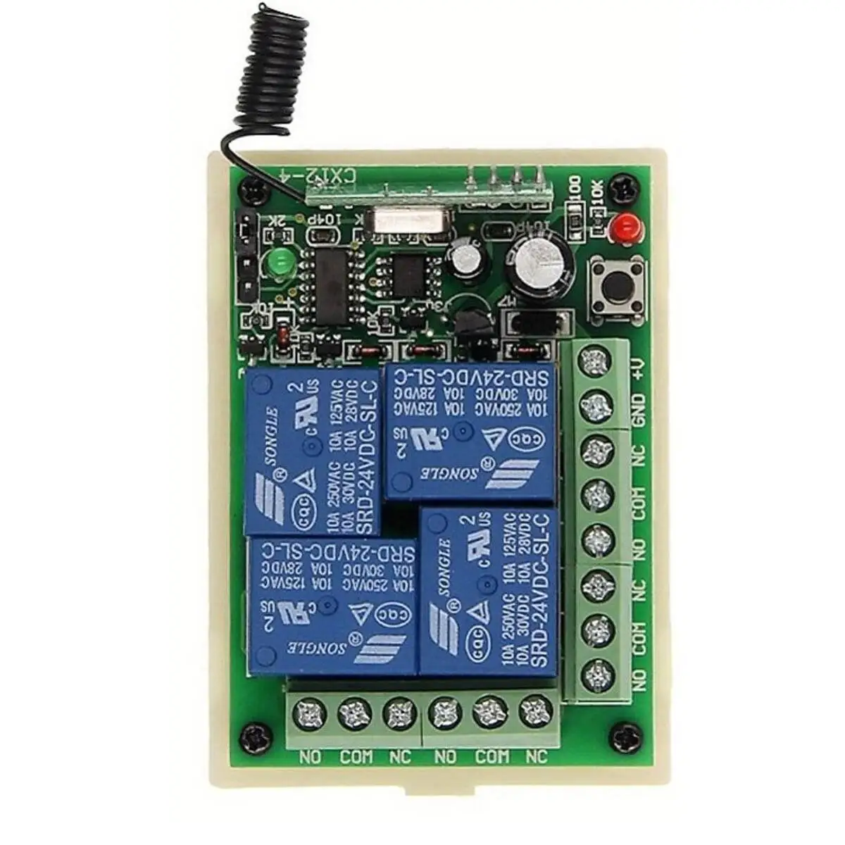 Δέκτης 24 volt 4 εντολών υψηλής ποιότητας (40803002).Ο έλεγχος είναι ασύρματος και η συχνότητά του είναι 433ΜHz. Ο δέκτης είναι ιδανικός για έλεγχο φώτων, TV, μηχανές, ανεμιστήρες, φωτογραφικές μηχανές, τηλεοπτικά σήματα, ακουστικά σήματα, ηλεκτρικά αυτοκινήτων , παραθύρων, κλειδαριών πορτών. πόρτας γκαράζ, σε διάφορα ηλεκτρικά είδη, όπως επίσης και για φώτα και led ταινίες. Μπορεί να προγραμματιστεί σε οποιαδήποτε από τις παρακάτω 3 καταστάσεις με την χρήση pin :