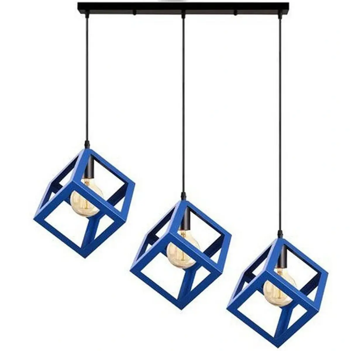 Φωτιστικό κρεμαστό τρίφωτο τετράγωνο κύβος μεταλλικό σε μπλε χρώμα με μαύρη ροζέτα (00500540). Έχει ένα ιδιαίτερο φωτιστικό σε vintage σχεδιασμό που θα εντυπωσιάσει και είναι ιδανικό για να διακοσμήσετε το χώρο σας και να δώσετε μια διαφορετική άποψη. Μπορεί να χρησιμοποιηθεί σε σαλόνι, κουζίνα, δωμάτιο, καφέ, μπαρ, εστιατόρια