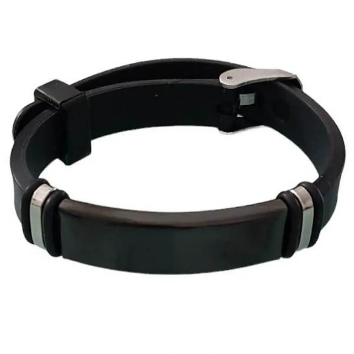 Μοντέρνο ανδρικό βραχιόλι σε μαύρο χρώμα AST17. Το λουράκι είναι από σιλικόνη και το υπόλοιπο από ανοξείδωτο μέταλλο stainless steel. Το λουράκι είναι σαν τα λουράκια από τα ρολόγια οπότε μπορεί να ρυθμιστεί το μέγεθος και να ταιριάξει ακριβώς με τον καρπό.